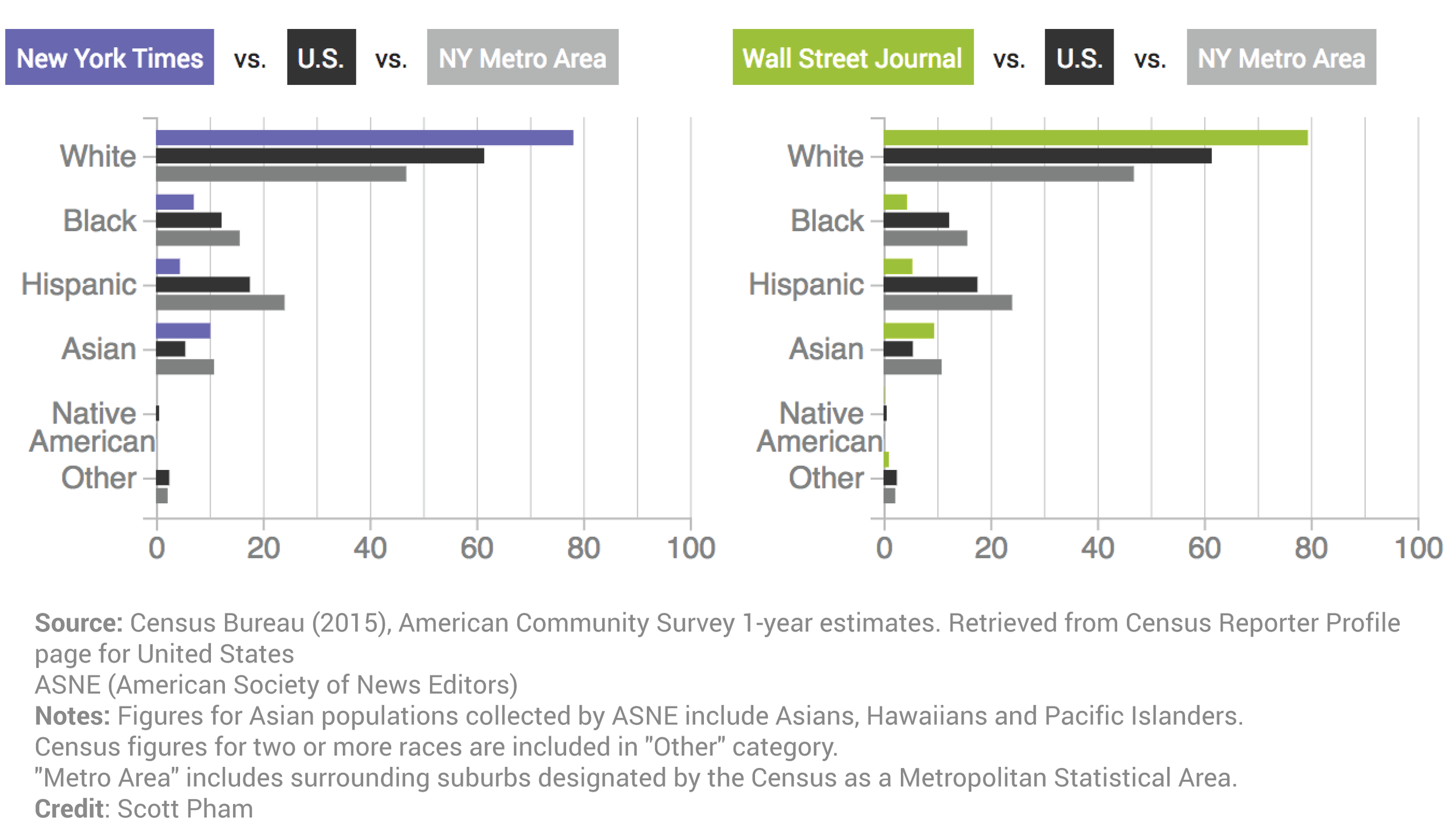 The Wall Street Journal and New York Times have news staffs that are 21 percent and 22 percent minority, respectively. The Los Angeles Times and Washington Post are more diverse — 34 percent and 31 percent minority, respectively.